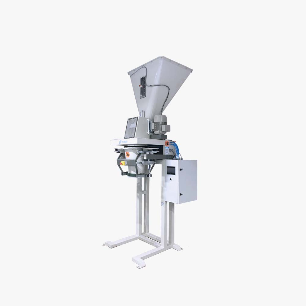The machine has three main sections of filling bunker, weighing unit and discharging spout. The filling bunker has a level sensor and an observation window. Sacks are mounted on the discharge spout of machine manually by the operator and pneumatically fixed onto the spout, and the product is transferred into the sacks after weighing. Then sewing operation is carried out manually.